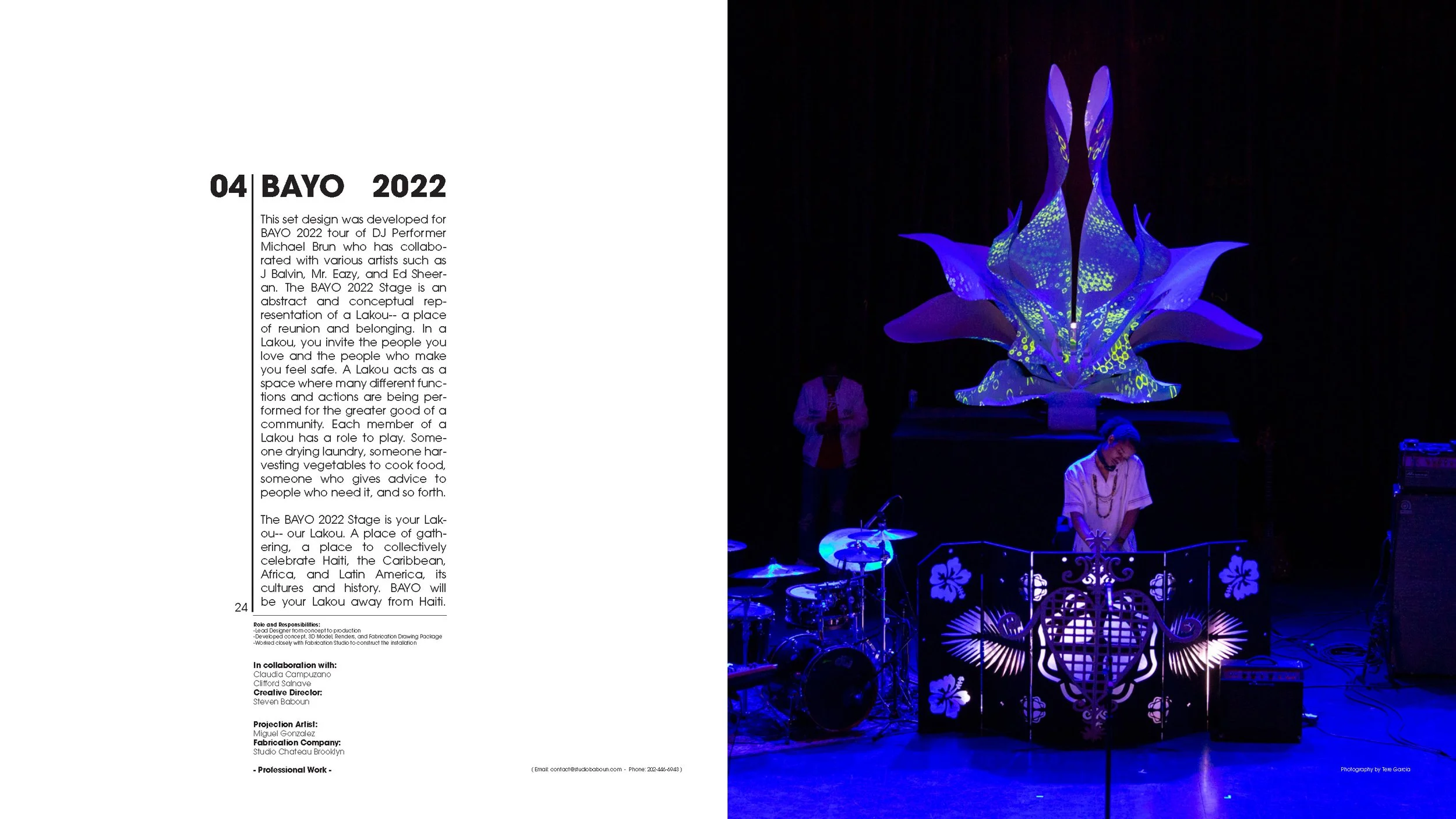This set design was developed for BAYO 2022 tour of DJ Performer Michael Brun. The BAYO 2022 Stage is an abstract and conceptual representation of a Lakou-- a place of reunion and belonging. In a Lakou, you invite the people you love and the people who make you feel safe. A Lakou acts as a