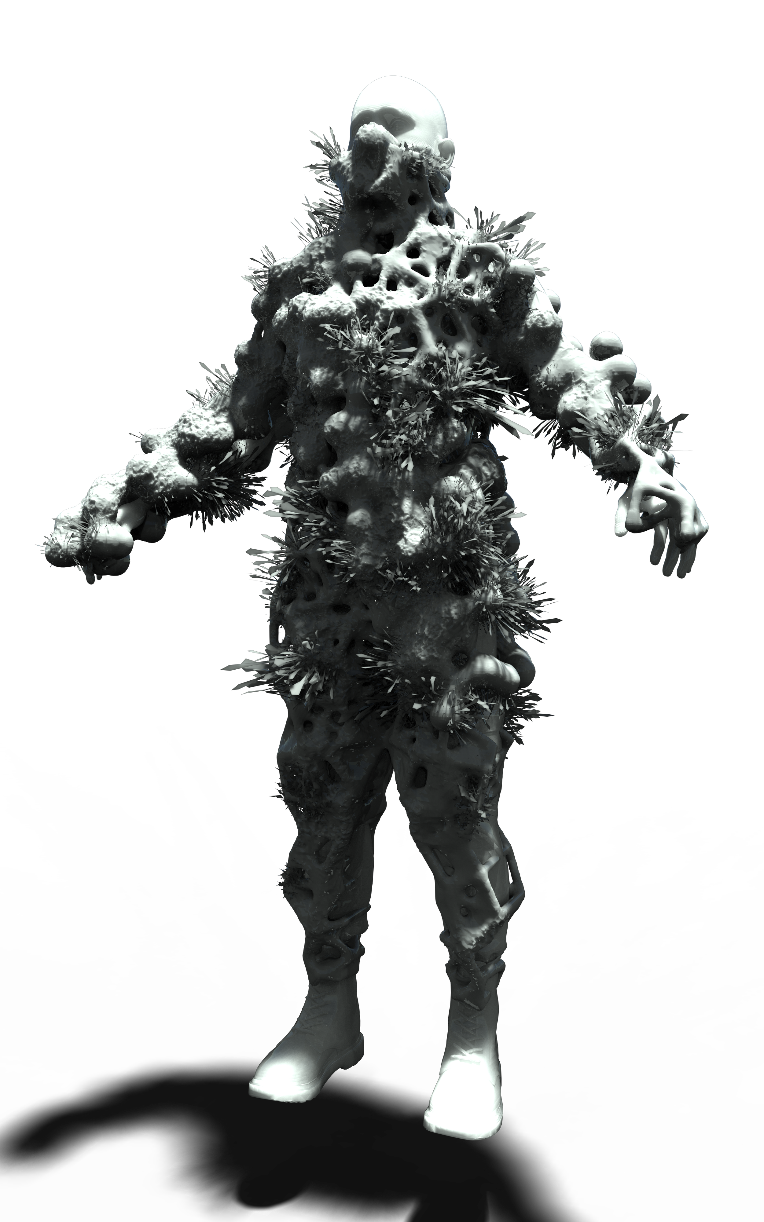 Inspired by Venom from Spiderman, this is a mycelium-like system that adapts to any body for survival. Eating what’s left of humanity, including the built environment: It's the year 2123, and this is what's left of our world. Thankfully, nature has come to save us. As a form of its own immune system, nature has evolved to reclaim its rightful place on Earth, consuming the unnatural structures erected by beings known as humans. Many of these humans, the ones who could afford the exorbitant price, departed our planet for a neighboring one, eager to exhaust its resources as they had Earth's. The less fortunate ones remained, but in an unexpected turn of fate, they became the lucky ones. Nature, in its boundless resilience, is saving them, providing shelter from the remnants of their own toxic legacies and offering sustenance from the very soil they had once poisoned. In the wake of this ecological renaissance, a new symbiosis between technology and nature has emerged. Visionary minds of the past foresaw the need for change and began crafting an algorithm, a blueprint for survival. This algorithm was not born of cold calculation but of a deep understanding of Earth's rhythms and a respect for the sun's life-giving rays.