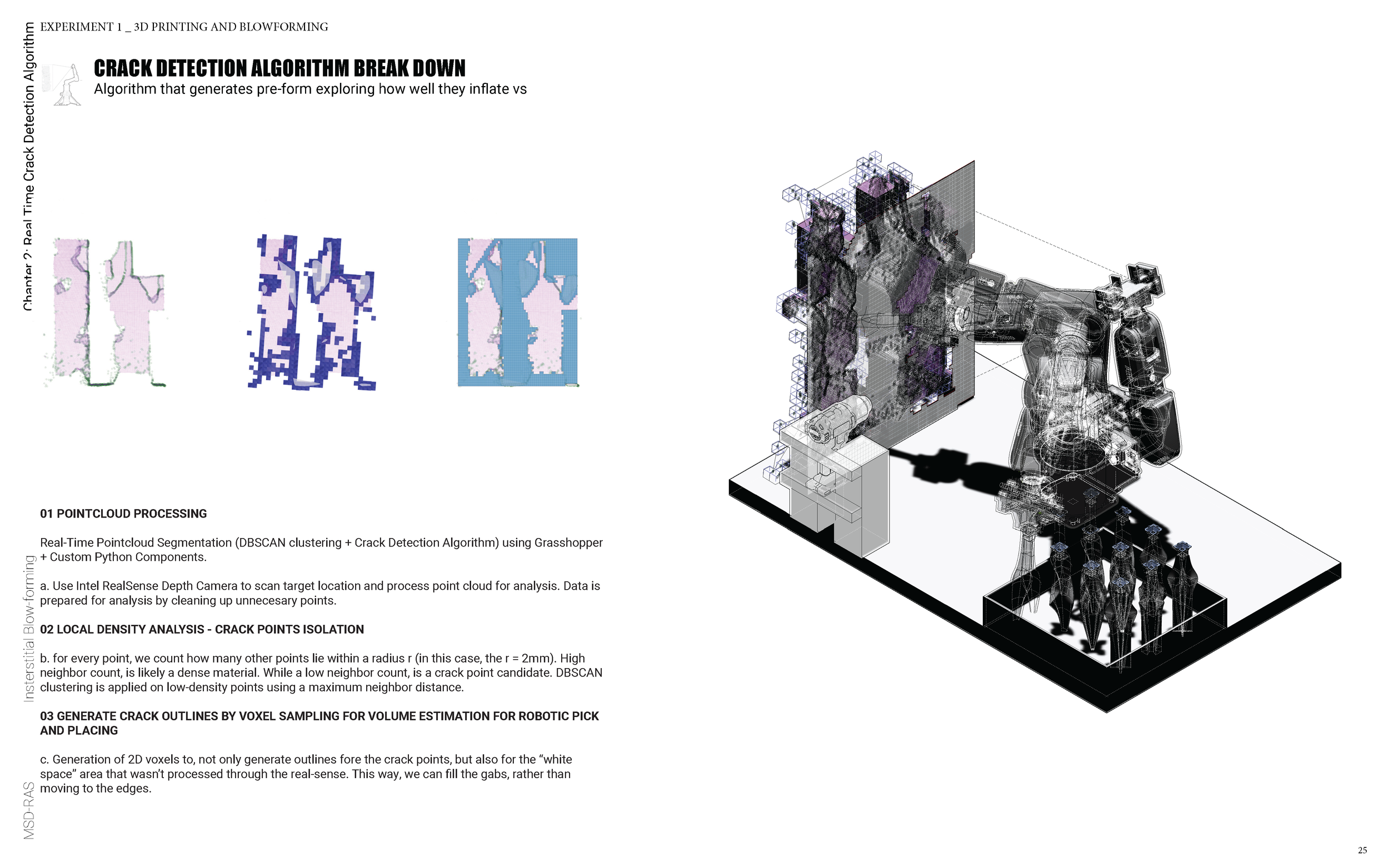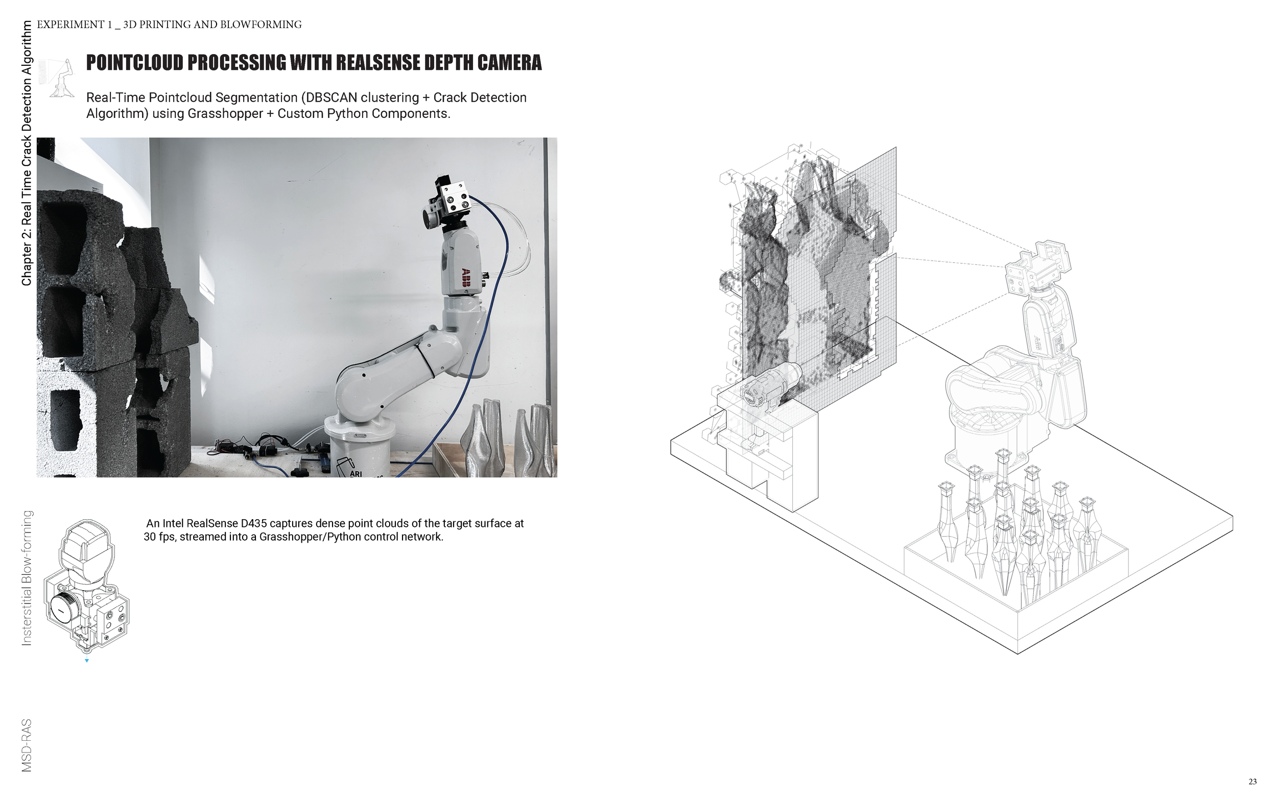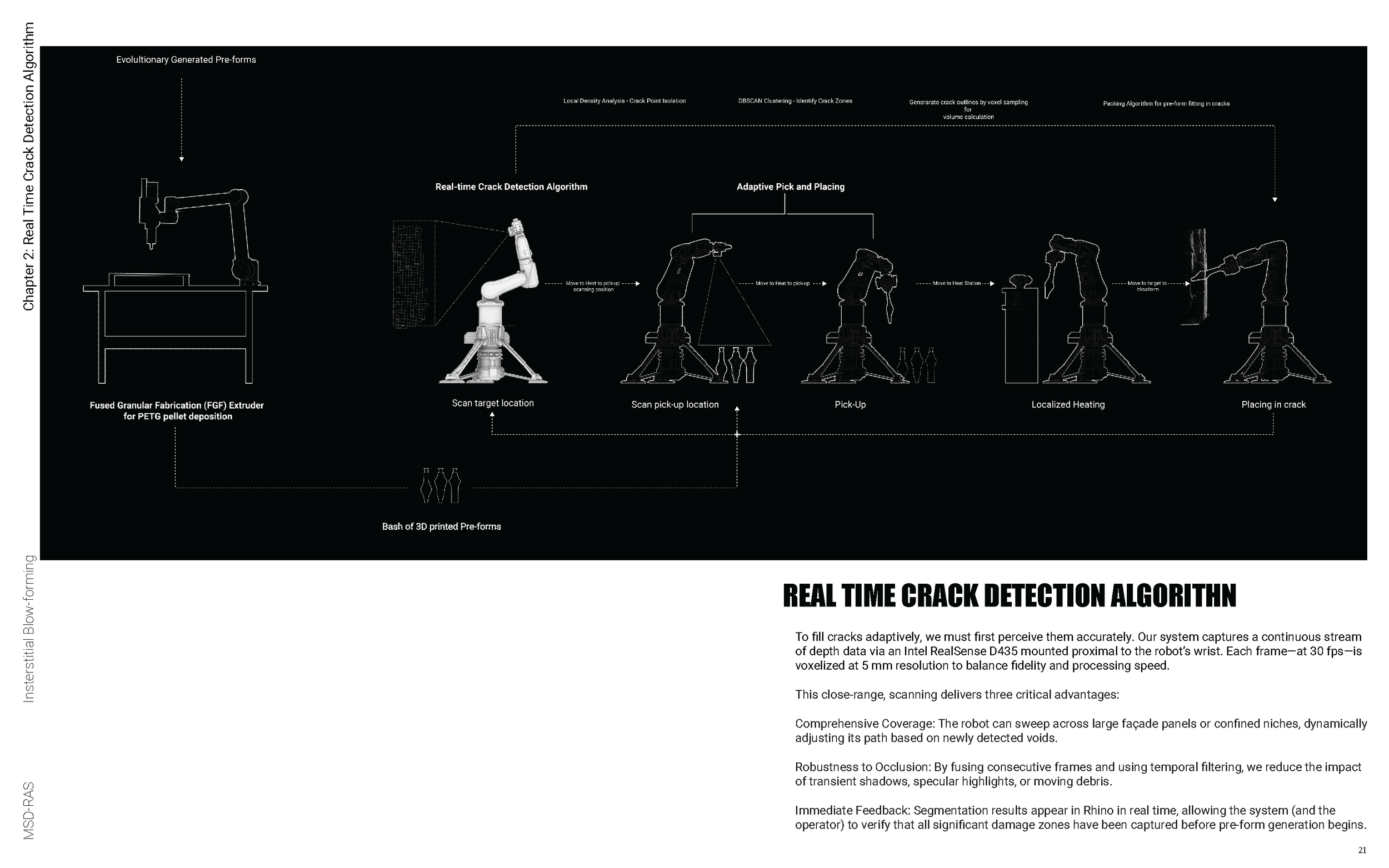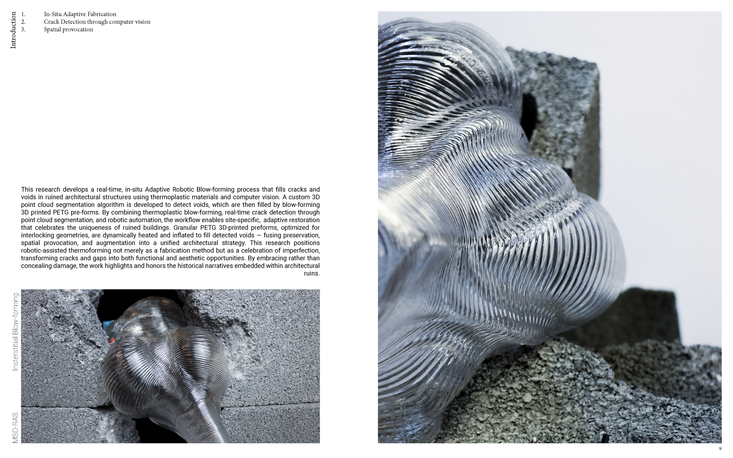 This research develops a real-time, in-situ adaptive robotic blowforming process that fills building cracks and voids. in ruined architectural structures. It simultaneously shapes and insertsusing thermoplastic printed formsmaterials guided byand computer vision with a. A custom 3D point cloud segmentation algorithm. is developed to detect voids, which are then filled by blow-forming 3D printed PETG pre-forms.T By combining thermoplastic blow-forming, real-time crack detection through point cloud segmentation, and robotic automation, the workflow enables site-specific , adaptive revitalizationrestoration that celebrates the uniqueness of ruined buildings. Granular PETG 3D-printed preforms, optimized for interlocking geometries, are dynamically heated and inflated to fill detected voids — fusing preservation, spatial provocation, and augmentation into a unified architectural strategy. This research positions robotic-assisted thermoforming not merely as a fabrication towardsmethod but as a celebration of imperfection, transforming cracks and gaps into both functional and aesthetic opportunities. By embracing rather than concealing damage, the work highlights and honors the historical decay narratives embedded within architectural ruins.