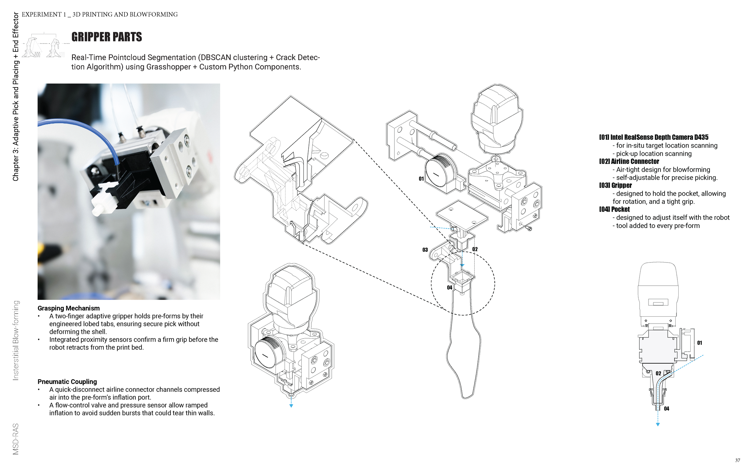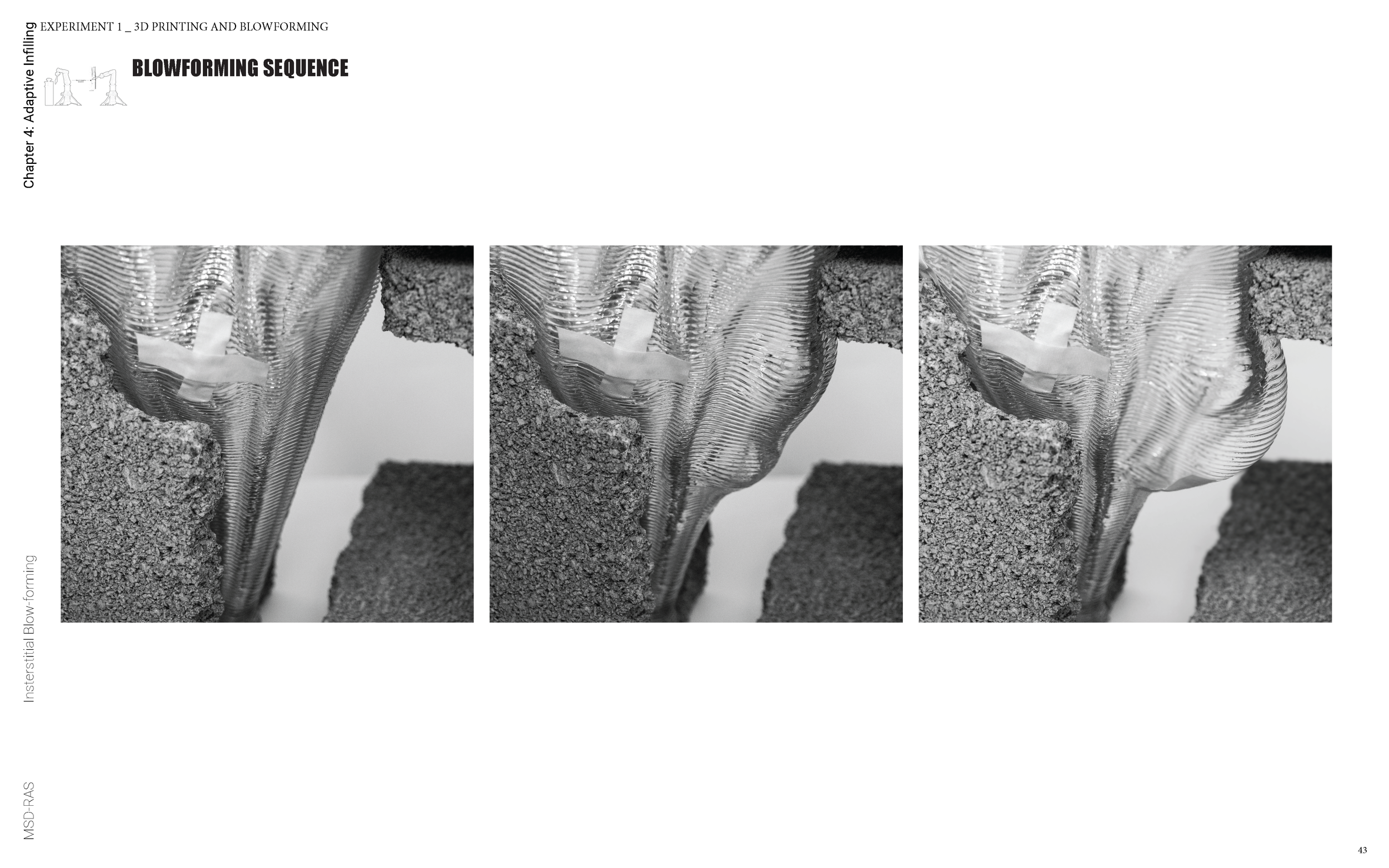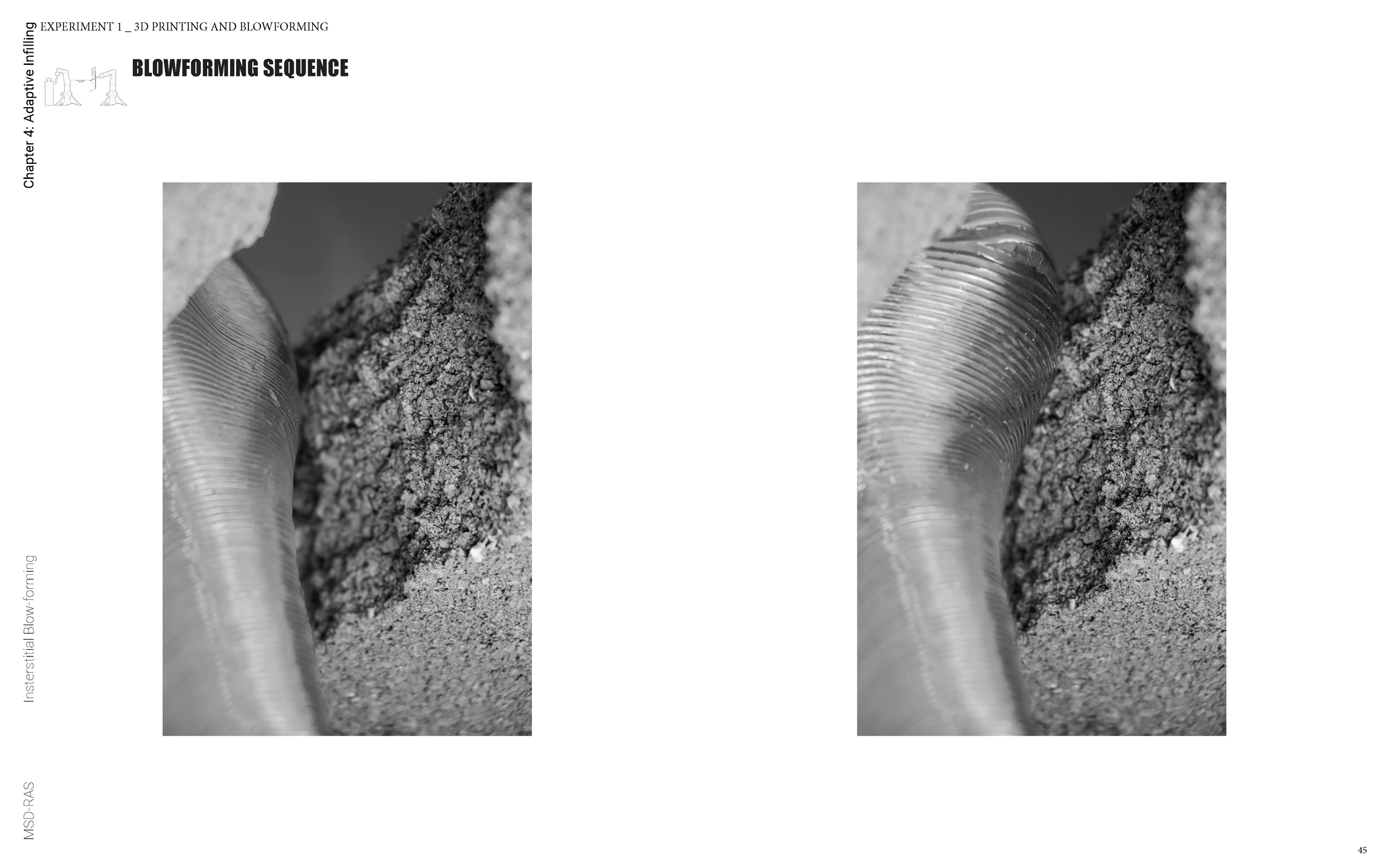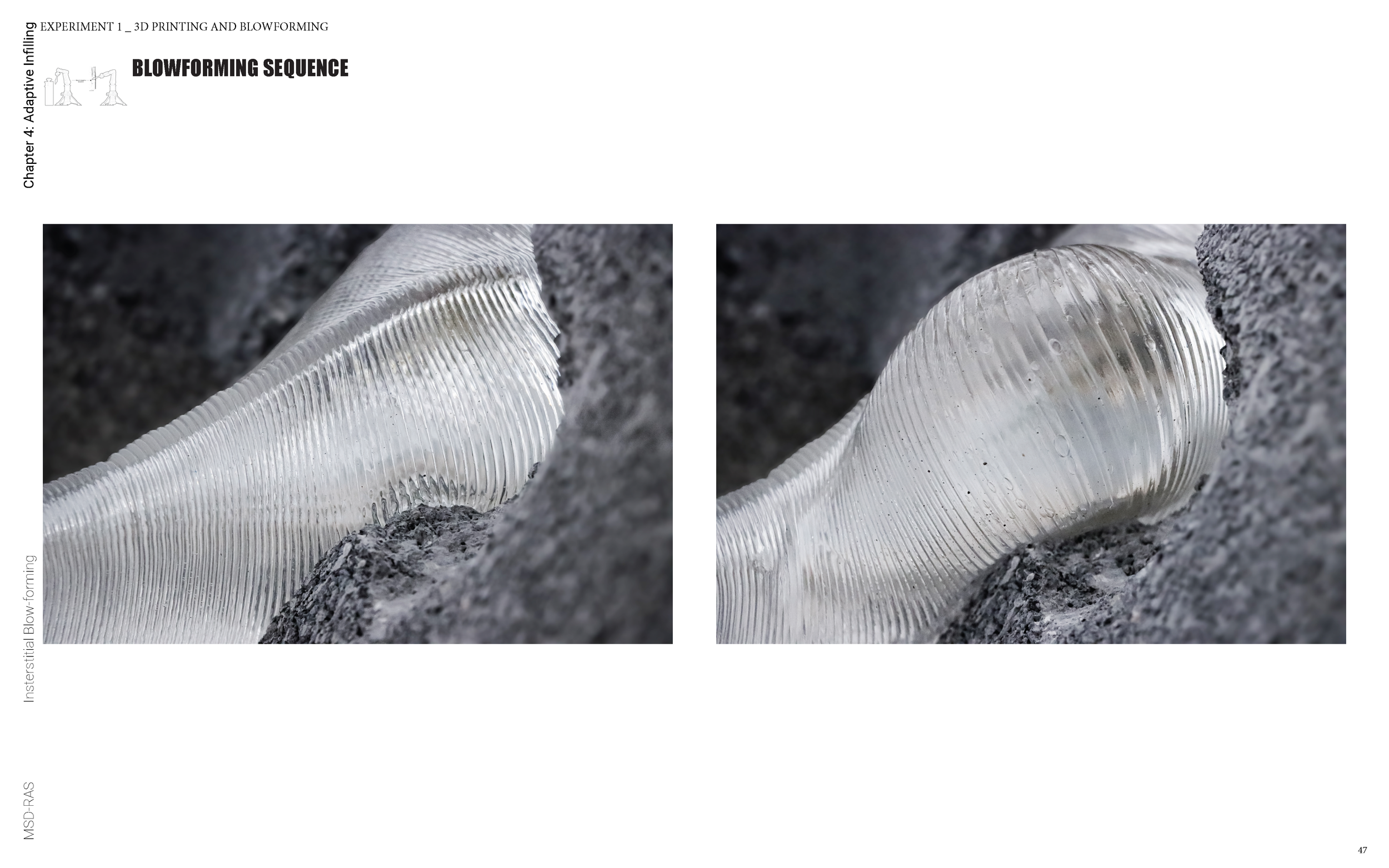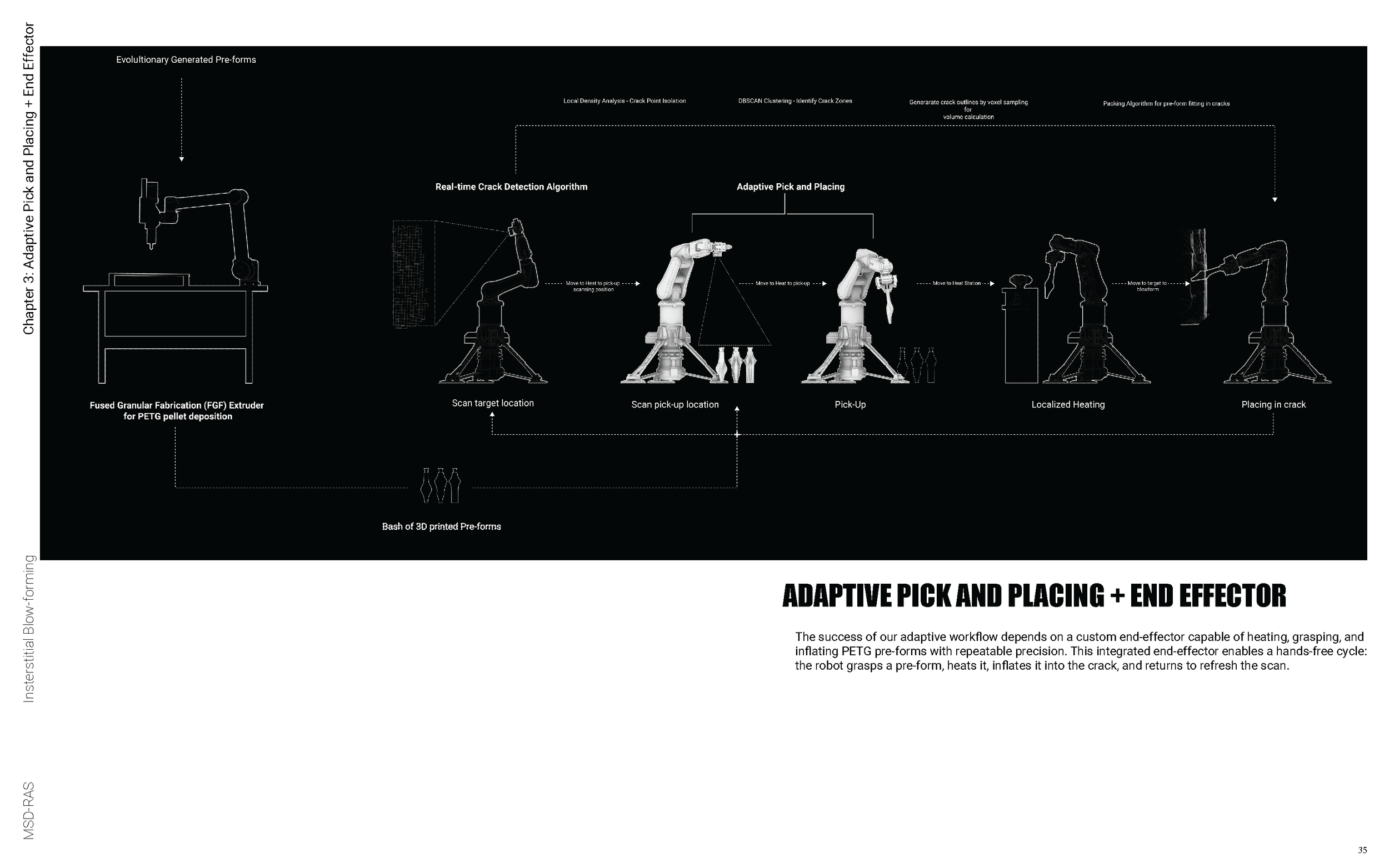 This research develops a real-time, in-situ adaptive robotic blowforming process that fills building cracks and voids. in ruined architectural structures. It simultaneously shapes and insertsusing thermoplastic printed formsmaterials guided byand computer vision with a. A custom 3D point cloud segmentation algorithm. is developed to detect voids, which are then filled by blow-forming 3D printed PETG pre-forms.T By combining thermoplastic blow-forming, real-time crack detection through point cloud segmentation, and robotic automation, the workflow enables site-specific , adaptive revitalizationrestoration that celebrates the uniqueness of ruined buildings. Granular PETG 3D-printed preforms, optimized for interlocking geometries, are dynamically heated and inflated to fill detected voids — fusing preservation, spatial provocation, and augmentation into a unified architectural strategy. This research positions robotic-assisted thermoforming not merely as a fabrication towardsmethod but as a celebration of imperfection, transforming cracks and gaps into both functional and aesthetic opportunities. By embracing rather than concealing damage, the work highlights and honors the historical decay narratives embedded within architectural ruins.